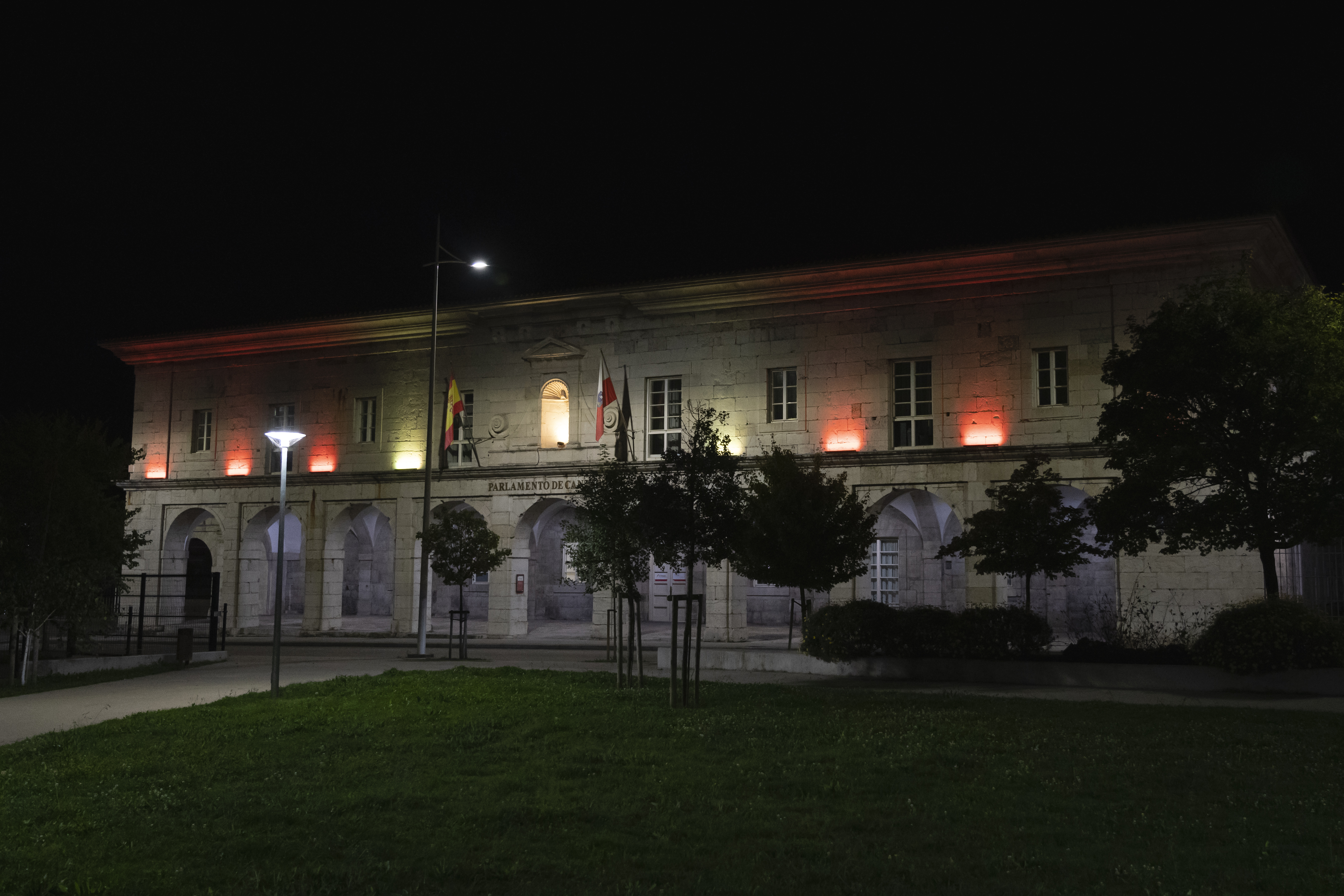 Con motivo de la celebración del Día de la Hispanidad, el Parlamento de Cantabria ha iluminado su fachada con los colores rojo y amarillo de la bandera de España.